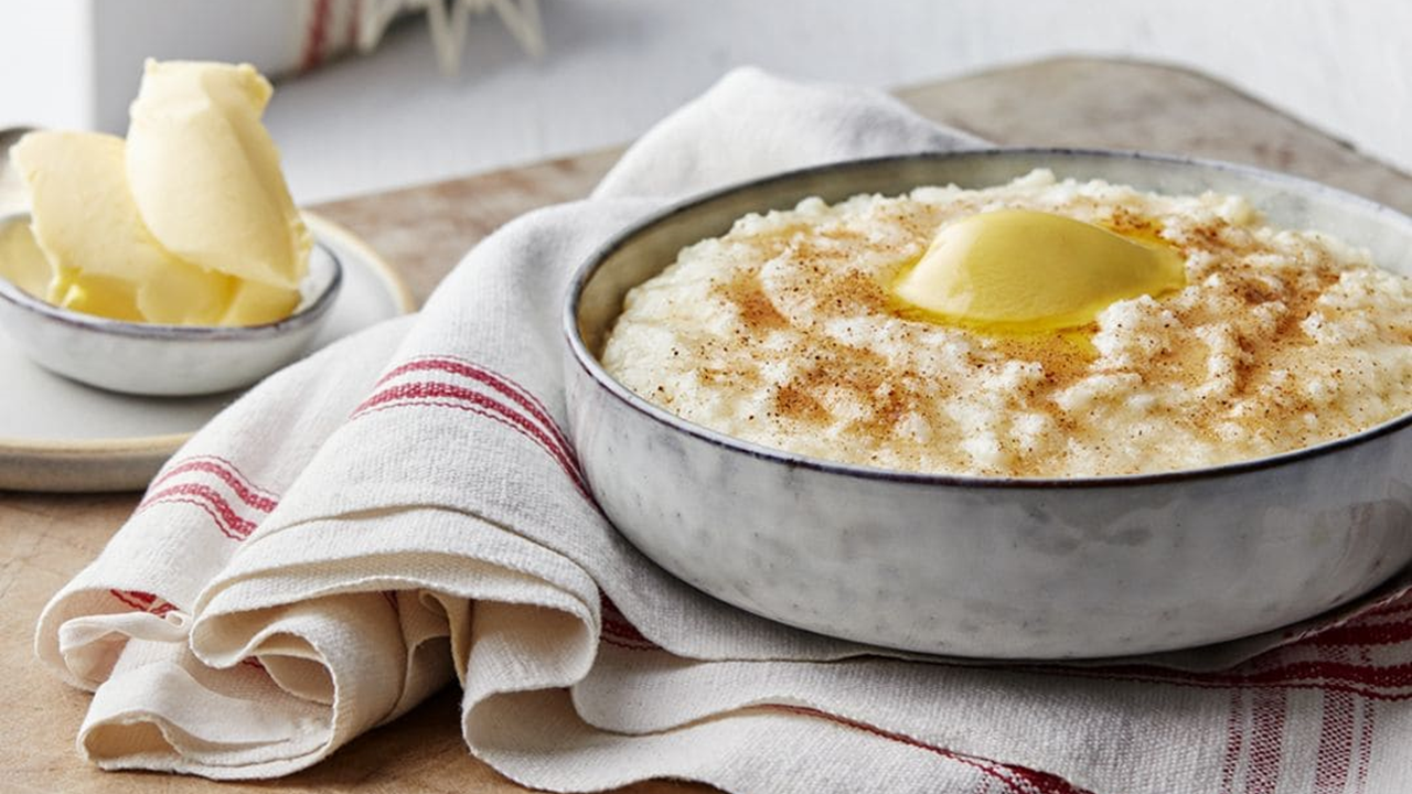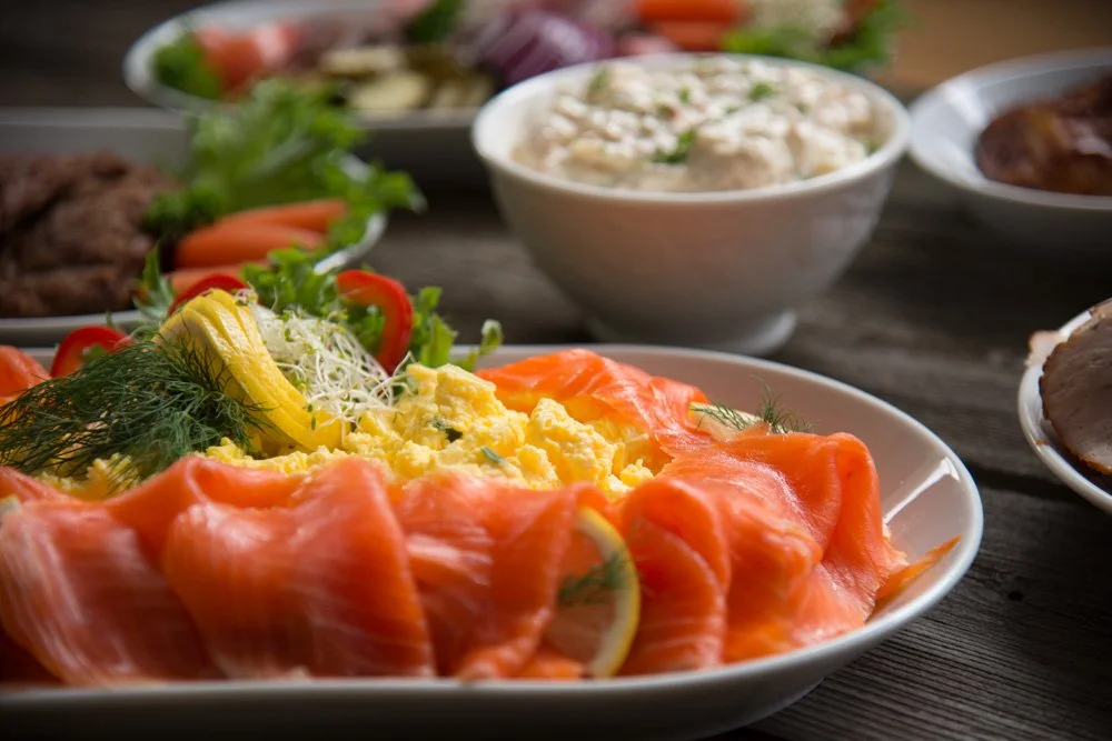 Risgraut, spekemat, laks, eggerøre, sild, potetsalat, fersk salat, brød og smør